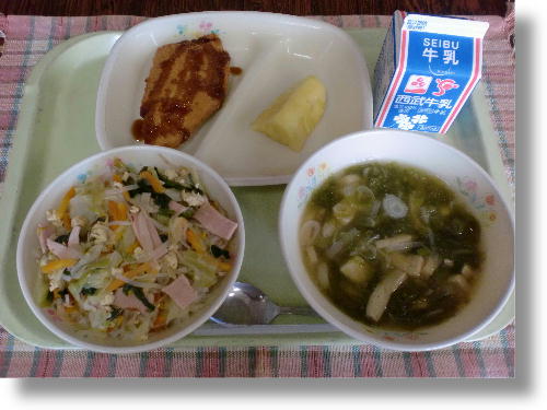 牛乳 沖縄ちゃんぽん 鮭チーズフライ アーサ汁
