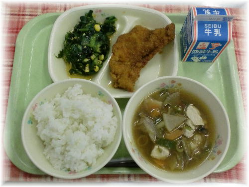 牛乳 カレー風味かつ丼 けんちん汁 小松菜サラダ