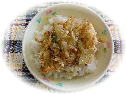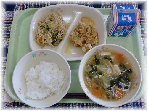 牛乳 かき揚げ丼 切り干し大根の和え物 味噌汁 かき揚げには桜えびが入っています。 桜エビは駿河湾で多くとれ、水揚げ後すぐに天日でよく乾燥させた素干しのほかに、煮干し、釜揚げなどの製品もあります。給食では素干しの桜エビを使っています。 桜えびは薄紅色で料理の色合いとしてよく使われますが骨や歯を丈夫にするカルシウムが多く含まれています。 残りもなく、しっかり食べてくれました。