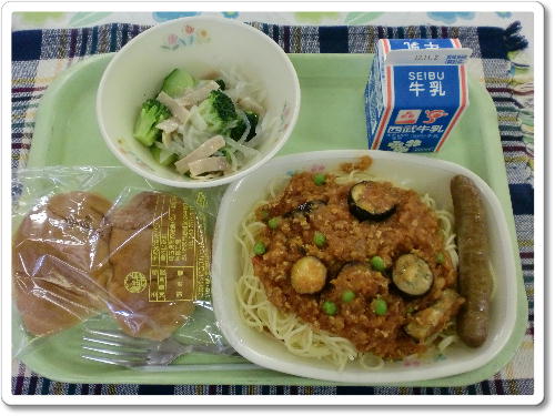 牛乳 バターロール シチリア風ミートソーススパゲティ ウインナーソティ