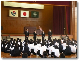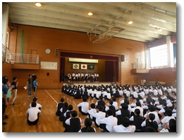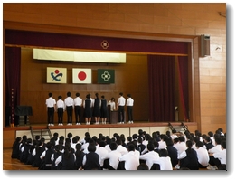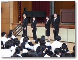 5/27月曜日、全校朝会が行われました。今回の全校朝会は、今週からお世話になる4人の教育実習生の紹介と、表彰がありました。