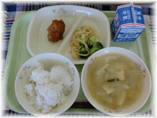 牛乳 ご飯 チキン南蛮漬け 味噌汁 温野菜 鶏肉はたんぱく質、脂質、ビタミン類やミネラル類を豊富に含んでいる栄養価の高い食品ですが、消化吸収が早く、古くから滋養源として食されてきました。皮を除けば低脂肪であることがよく知られており、良質なタンパク質を含み、皮や骨の部分にはコラーゲンが多く含まれ、美肌効果があることで人気です。今日は甘酸っぱいタレでからめた南蛮漬けにしました。生徒たちは残さず食べていました。