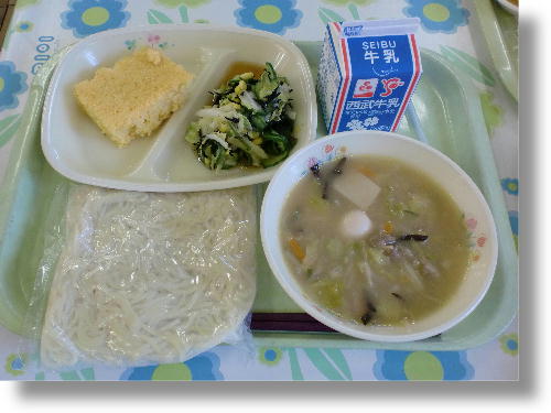 長崎県長崎市発祥のちゃんぽんは、長崎県の郷土料理です。明治時代中期、長崎市に現存する中華料理店「四海樓」の初代店主陳平順が、当時日本に訪れていた大勢の中国人(当時は清国人)留学生に、安くて栄養価の高い食事を食べさせる為に考案したとされています。肉、魚介類、野菜など十数種の具材をラードで炒め、豚骨と鶏がらでとったスープで味を調えます。そこにちゃんぽん用の麺を入れて煮立てます。これが他の中華麺類との大きな違いです。太い麺と具材の多さが特徴です。給食では麺を入れて煮立てることはできませんが、ちゃんぽんスープを味わって食べました。