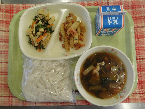 牛乳 ねぎまうどん 大豆とポテトの揚げ煮 ほうれん草のオイスターソース炒め エネルギー:800kcal たんぱく質31.3g