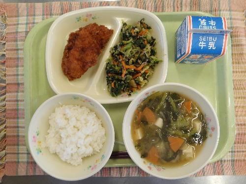 今日の給食は「勝どん」です。明日は、私立高校を受験する3年生がたくさんいると思います。気合いを入れて受験で「勝つ」ようにかつ丼にしました。そして、磯の香り和えにはたっぷりほうれん草を使いました。ほうれん草には鉄分が多く含まれています。鉄は全身に酸素を送る働きをします。鉄が不足すると酸欠状態になり、十分に力が発揮できません。かつ丼、ほうれん草をしっかり食べて、明日の試験で力が発揮できるよう頑張ってほしいと思います。