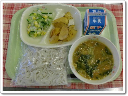 牛乳  カレーうどん さつまいもチップス 温野菜