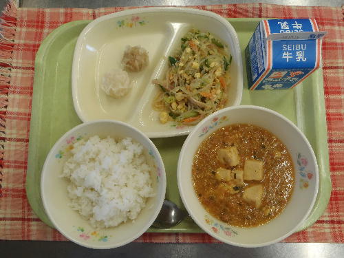牛乳 ご飯 麻婆豆腐 蒸ししゅうまい 中華サラダ
