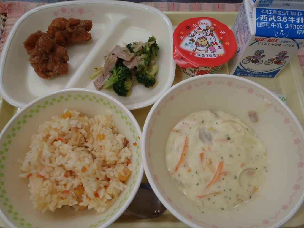 ☆本日の献立☆クリスマス給食キャロットピラフドリア風牛乳フライドチキンブロッコリーサラダクリスマスカップデザートエネルギー 881 kcalタンパク質 35.1 g脂質 28.9 g食塩相当量 4.2 g きょうはクリスマス給食でした。キャロットピラフにクリームソースをかけて食べていただきます。少し早めのクリスマス気分を味わっていただきました。