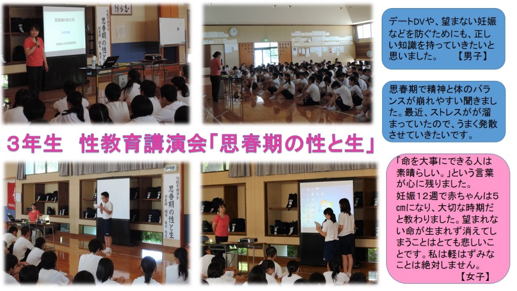 7月7日(木)、3年生の性教育講演会を実施しました。助産師の橋本幾子様を講師にお迎えし、「思春期の性と生」という演題でお話をいただきました。感想を紹介します。