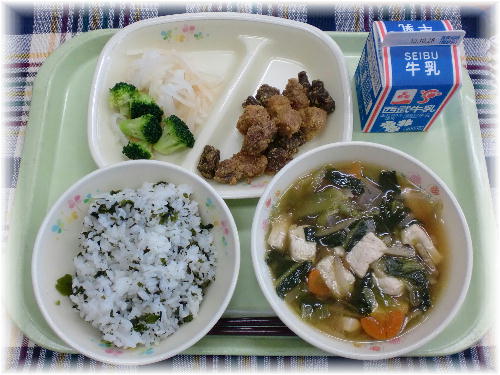 牛乳 わかめご飯 豚肉とレバーのごまだれ けんちん汁 温野菜