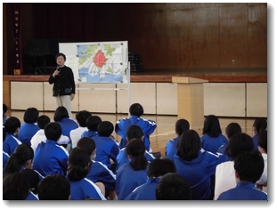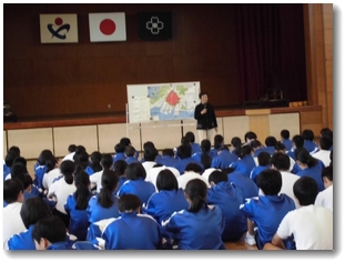 5/24の第5校時に3年生は修学旅行にそなえて、事前の平和学習を体育館で行いました。広島被爆者援護会に所属し、実際に、広島で、原爆に関する講話をしている講師の方に、広島からわざわざ来ていただいて、話をしてもらいました。生徒たちも、なかなか聞けない、現地の生の声を聞くことができ、貴重な経験をすることができました。講師の方は、暑い上に、給食後の5時間目ということで、生徒から居眠りが出てしまうことを予想していましたが、生徒があまりに集中し、話を聞いていることに感心していました。