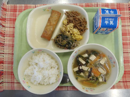 牛乳 ビビンバ ひじき入り春巻き 春雨スープ