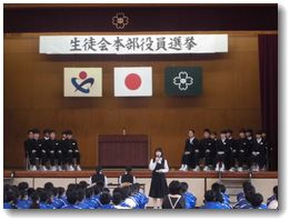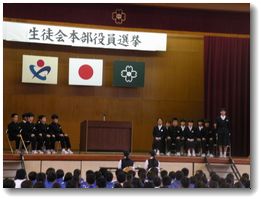 先週の10月18日(金)の午後、第37期生徒会立会演説会、生徒会役員選挙が行われました。2年生からは6名、1年生からはなんと9名もの立候補者が出て、この日まで選挙運動が行われてきました。当日は選挙前の最後の立会演説会が開かれ、各自が、今後の上柴中をさらにより良くしていきたいという熱い思いを生徒全員に訴えかけました。生徒諸君は、自分の目で見て、耳で聞いて、頭で考えて、未来の上中を背負って立てる人材を、自分の判断で決めることができました。2年生から6人、1年生から4人が選ばれました。ただ、落選した人も、決して、下を向く必要はありません。今の前向きな気持ちを忘れないこと!当選した人は、責任重大です。『自分のためではなく、人のために働ける人』を目指してください。