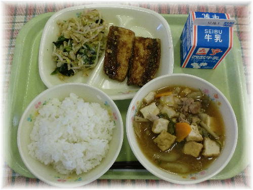 牛乳 ご飯 サンマのかば焼 豚汁 おひたし