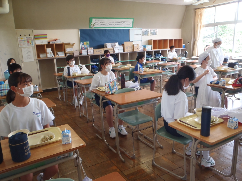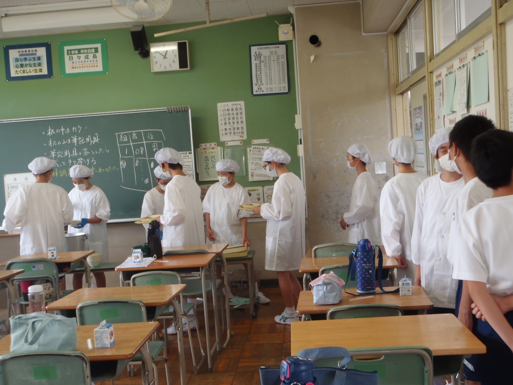 きょうはBグループの皆さんが給食を食べました。準備はソーシャルディスタンスを保ってスムーズに配食していました。しばらくの間は食器を持つ当番さんに使い捨て手袋をして準備していただいています。給食の後片付けは、5分ずつ時間をずらして給食室や廊下が密集しないようにしています