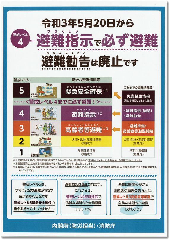 また、令和3年5月20日から「警戒レベル4 避難指示で必ず避難」となり、避難勧告は廃止となりました。