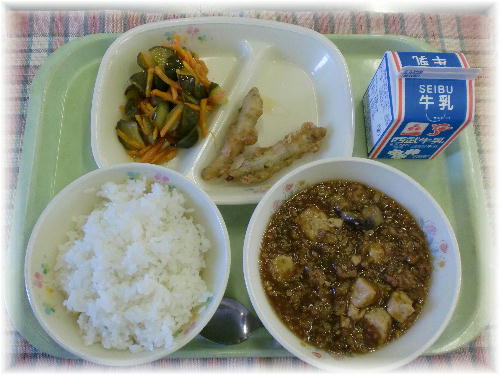 牛乳 ご飯 麻婆ナス豆腐 ワカサギフリッター