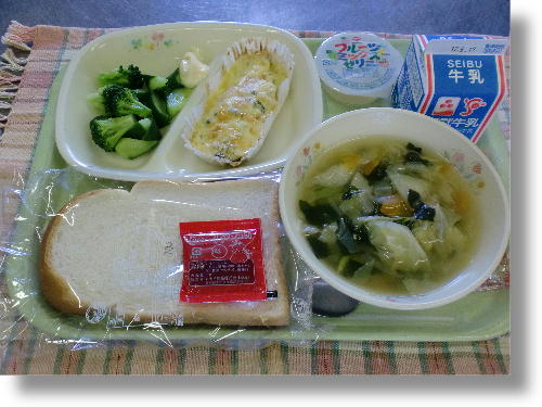 牛乳 山型食パン 鮭のマヨネーズ焼き 野菜コンソメスープ 温野菜 ゼリー 「 野菜コンソメスープ」にはキャベツが入っています。キャベツはアブラナ科アブラナ属の多年草。野菜として広く利用され、栽培上は一年生植物として扱われています。葉がやわらかくてくせがないので、いろいろな料理に利用されます。 きゃべつには特有の成分としてビタミンUがありますが、これは胃の働きを活発にし、新陳代謝をよくする働きがあります。