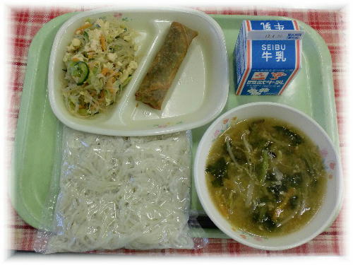 牛乳 ごま味噌ラーメン 春巻き 中華サラダ