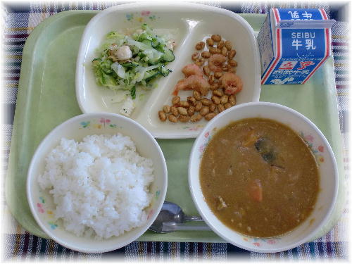 牛乳 手作りカレーライス 大豆のカリカリ揚げ シーフードマリネ