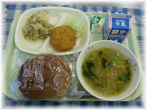牛乳 エビカツバーガ- タルタルソース ジャーマンポテト オニオンスープ じゃがいもはビタミンCが豊富に含まれています。ビタミンCは熱に弱いビタミンですが、じゃがいものビタミンCは澱粉でガードされているので、壊れにくいという特徴があります。
