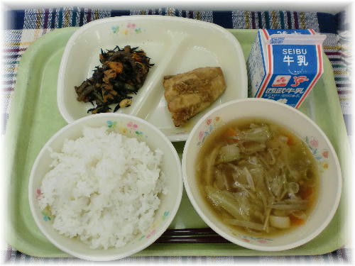 牛乳 秋鯖のねぎ味噌焼き 大豆の磯煮 ちゃんこスープ