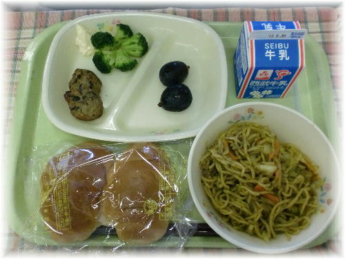 牛乳 バターロール インディアン焼きそば 温野菜 巨峰 今日は今が旬の巨峰がデザートです。巨峰は糖質が多く、ブドウ糖と果糖がそれぞれ半分ずつ占めています。