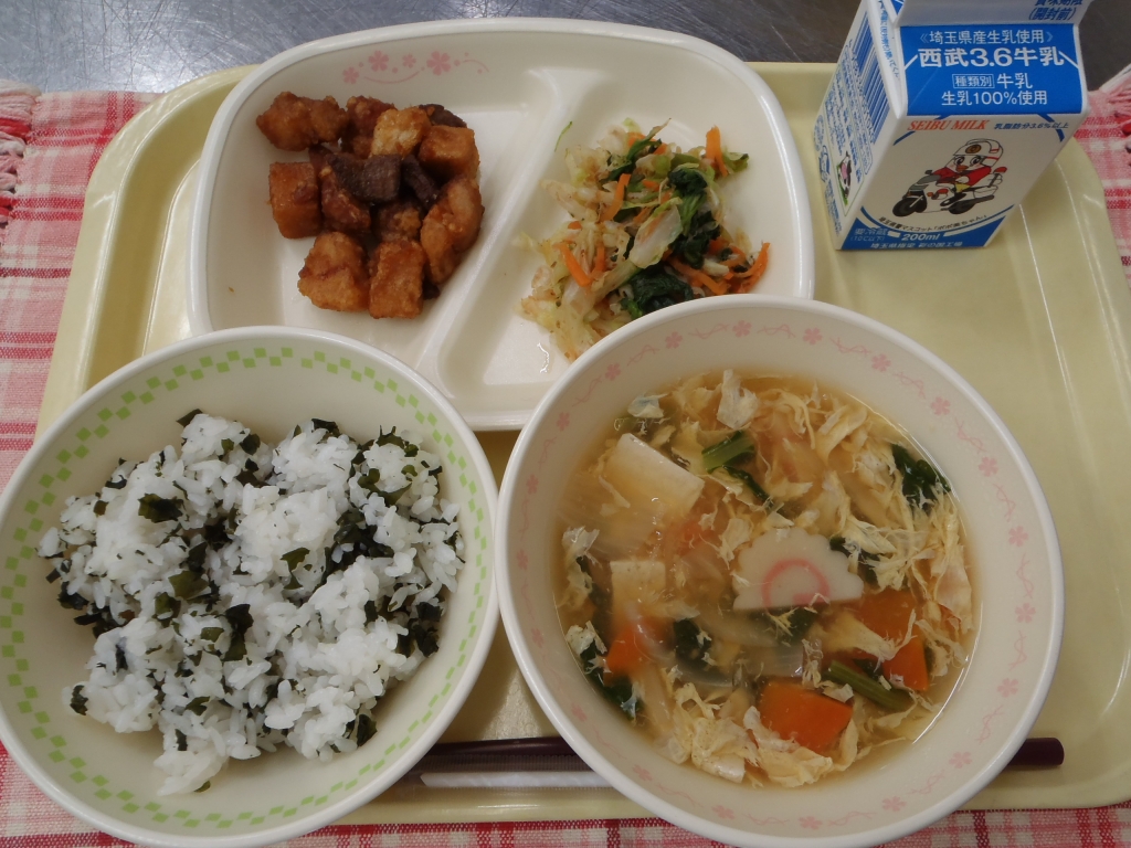 わかめご飯は人気があるので残りが少なかったです。豚肉の香味揚げはレバーや高野豆腐と一緒に豚肉を揚げてカレー味のたれにからめています。