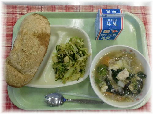 豆腐団子のスープには白菜を使っています。白菜の栄養価の一番の特徴は豊富なカリウムの含有量です。カリウムは利尿作用があり、ナトリウムの排泄を促進し、高血圧の予防に効果があります。 今日はいつもの給食よりも、「豆腐団子のスープ」をたくさん作りましたが、生徒達の好きなメニューだったので、とってもよく食べていました。