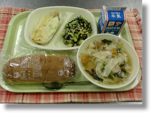牛乳 黒パン 鮭のマヨネーズ焼き ワンタンスープ