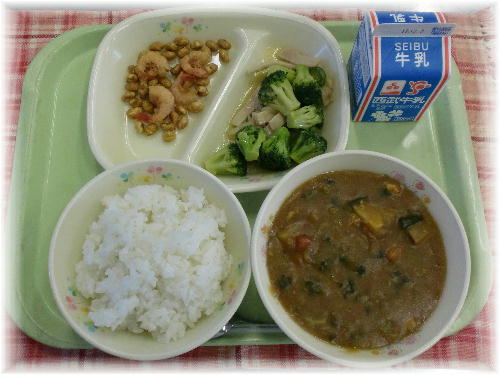 牛乳 小江戸カレーライス 大豆のカリカリ揚げ ブロッコリーサラダ