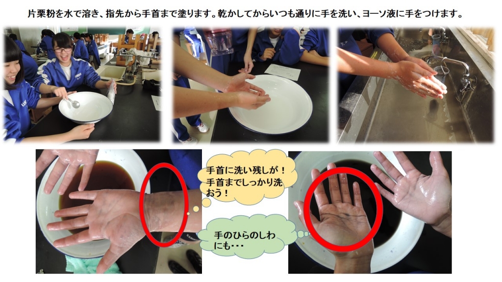 保健委員会では、かぜ予防の取り組みとして手洗いを呼びかけていますが、実際に「手の洗い残し」を見る実験を行いました。結果は3学期の集会で発表する予定です。
