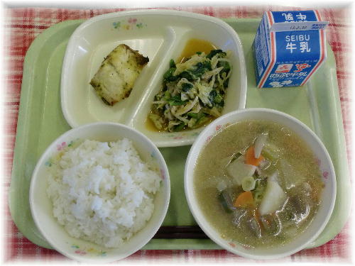 牛乳 ご飯 さばの味噌マヨネーズ焼き からし和え 豚汁