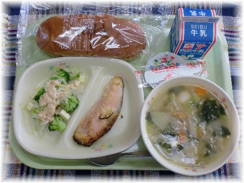 牛乳 パインパン 鮭のムニエル 野菜コンソメスープ 温野菜 フルーツゼリー