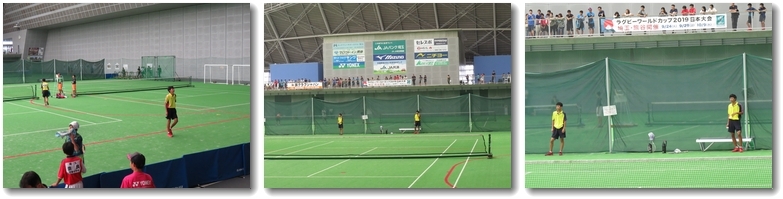 ソフトテニス男子の個人戦は女子同様、熊谷ドームで行われました。卓球部2回戦の試合途中、後ろ髪引かれる思いで、切り上げ、