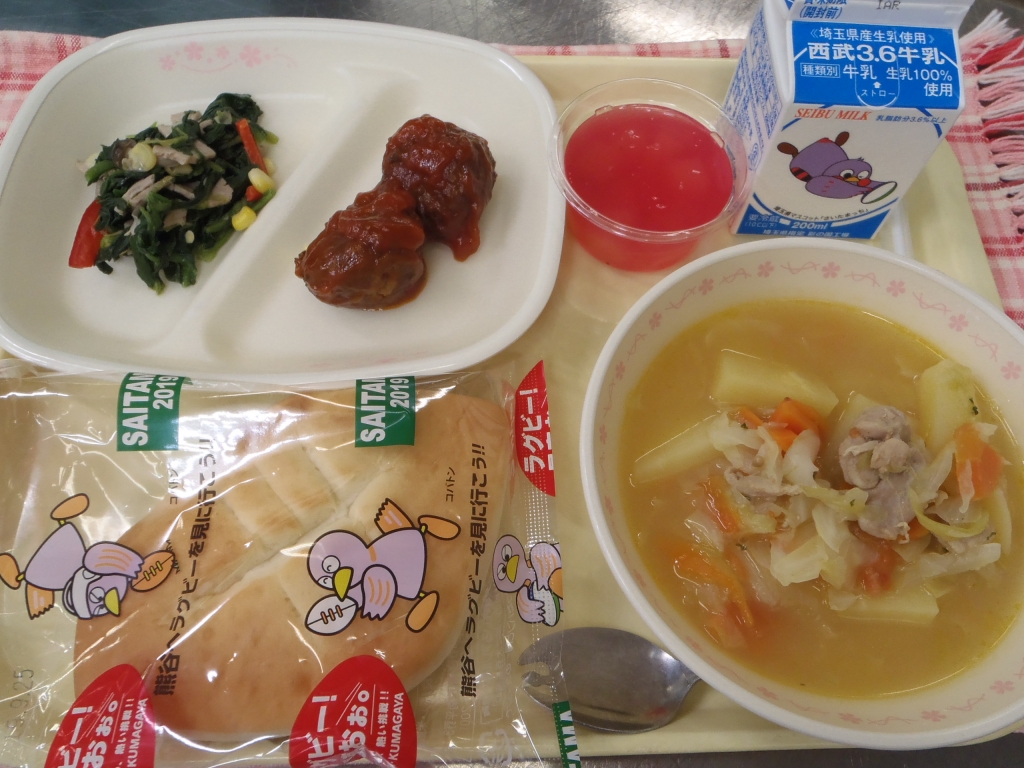 きょうは、熊谷ラグビー場で行われる「ロシア対サモアの試合」にちなんで「ロシア料理」を給食に出しています。「シチー」は「シー」とも呼ばれ「キャベツ」などの野菜がたっぷり入ったロシアの家庭料理です。また、ボルシチに使われるビーツを煮出してりんご缶をたっぷり入れて「ビーツゼリー」を作りました絵文字:キラキラ