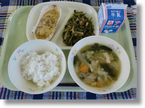 牛乳 ごはん あじのピリ辛マヨネーズ焼き クーブイリチー