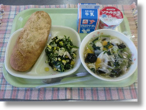 牛乳 きなこ揚げパン ワンタンスープ ほうれん草と卵のソティ ヨーグルト