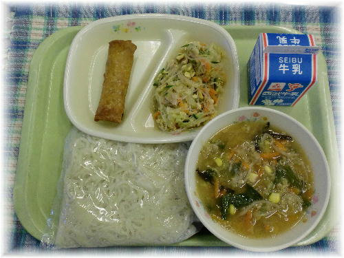 牛乳 ごま味噌ラーメン 春巻き 中華サラダ 中華サラダには春雨が入っています。春雨とは、じゃが芋やさつま芋の澱粉を原料にして作られる乾麺のことで、柔らかく滑らかな食感が特徴です。給食では緑豆春雨を使用しています。緑豆春雨とは、緑豆(りょくとう)の澱粉を原料にした細い春雨のことで、春雨よりも腰が強めで透明感が高く、煮崩れしにくい性質があります。春雨も緑豆春雨も煮物やスープ、炒め物、和えもの、サラダなどに使われます。