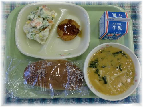牛乳 パインパン エビカツ マカロニのヒリヒリ煮 ポテトサラダ