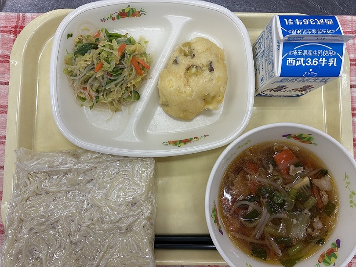 18日の給食は、広東麺 牛乳 石垣団子 春雨サラダでした。