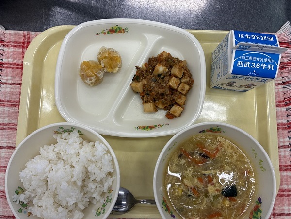 19日の給食は、ごはん 牛乳 県産にんじんしゅうまい 麻婆豆腐 コーン入り家風スープでした。